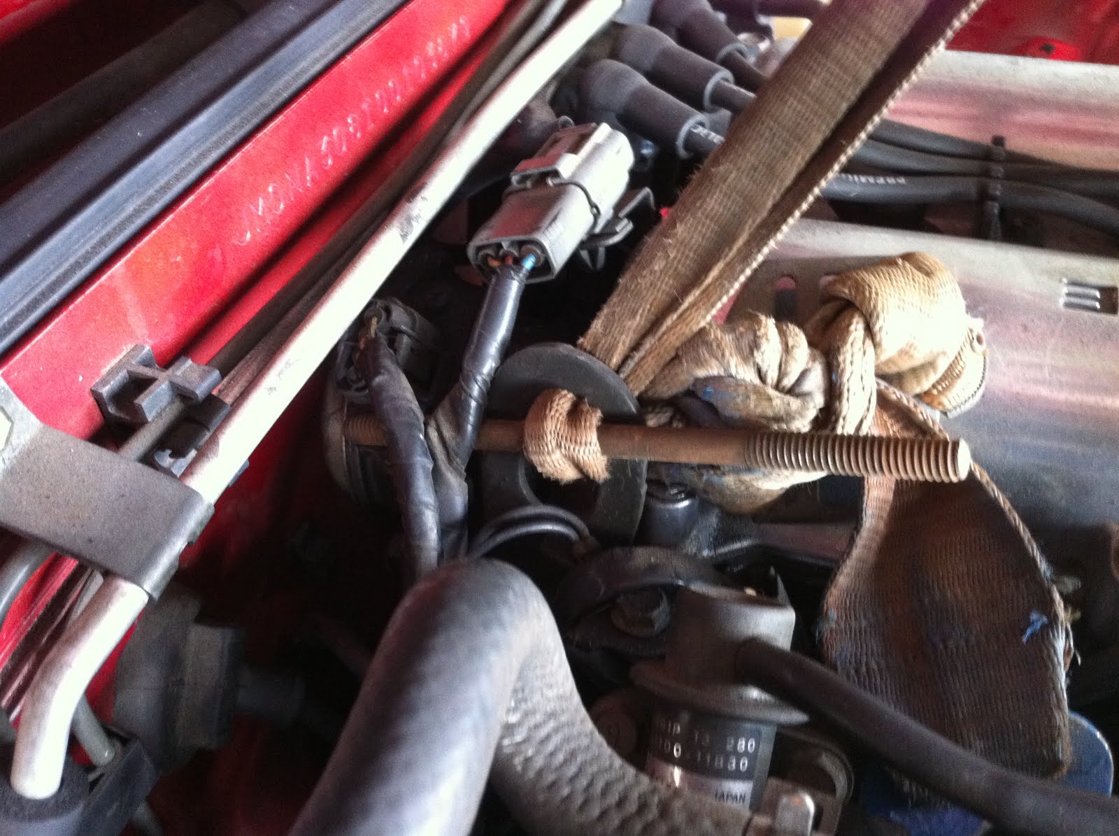 To replace it, we had to borrow an engine hoist from my uncle, then undo the engine mount bolts so we can lift the engine far enough so when we did unbolt the oil pan, we can remove it as it would hit the crossmember..